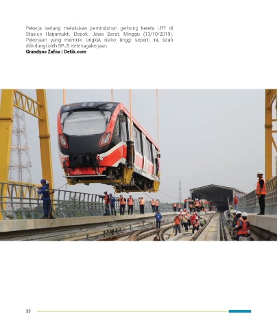 Pekerja sedang melakukan pemindahan gerbong kereta LRT di